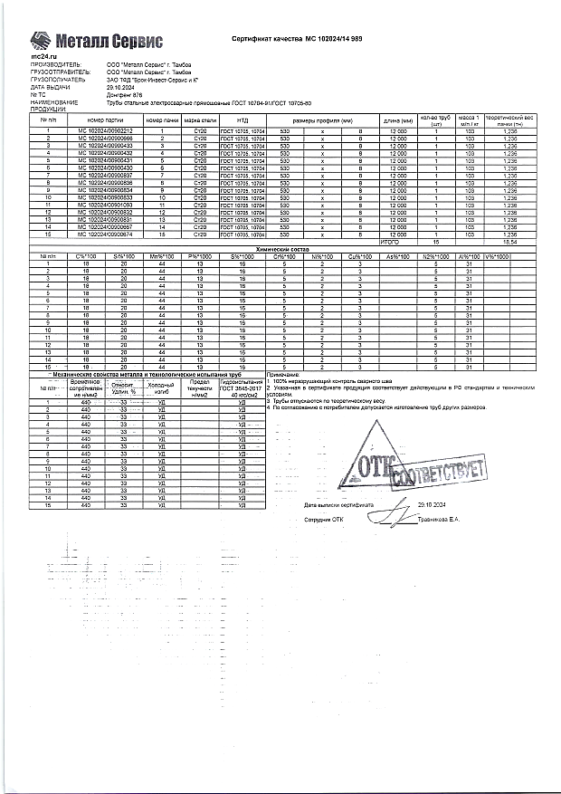 Для изготовления ЭСВ труб 530х8 мм используется углеродистая низколегированная сталь повышенной прочности. Метод изготовления, параметры трубы и допустимые отклонения от нормы зафиксированы в ГОСТ 10704-91. Все изделия, представленные на сайте, соответствуют установленному стандарту: мы можем в любой момент предоставить сертификаты, которые подтверждают качество нашей продукции.